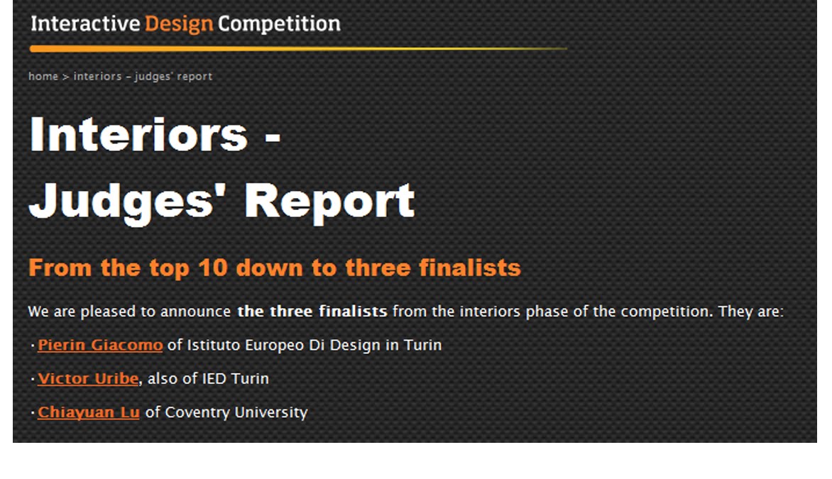 Victor was the very first student to upload an entry to the competition website. He separates the passenger compartment from the mechanical elements of the vehicle, allowing a completely different type of car interior with ‘maglev surfaces’ permitting massive re-configurability of the space. Judges thought it was not only “cool”, but also “a simply brilliant project”. They were particularly impressed by the way he had clearly laid out his concept, and how three key words - ‘comfortable’, ‘flexible’, ‘simple’ - perfectly described the project.